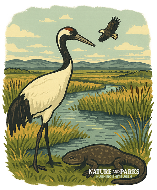釧路湿原国立公園がテーマ。タンチョウ、オジロワシ、キタサンショウウオをモチーフに、阿寒山群もイメージ。遠くを見渡せることで湿原の広さと生物の多さを表しています。